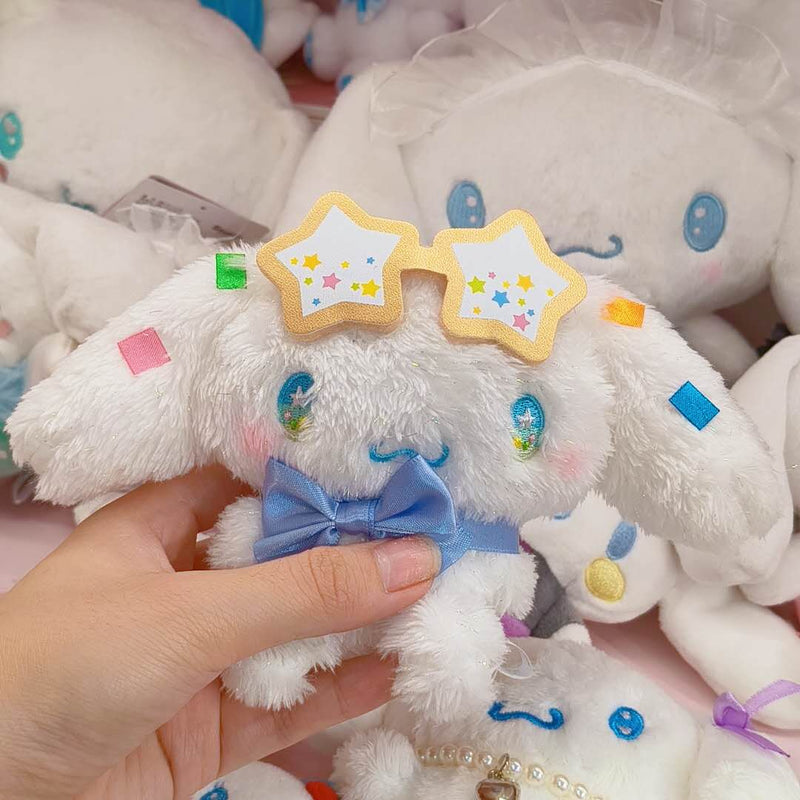Get ready to celebrate with the Cinnamoroll Party Star Plush, a dazzling and fun-filled addition to your Sanrio collection! This adorable plush features Cinnamoroll dressed in a festive outfit with a light blue bowtie, colorful confetti details on his ears, and stylish star-shaped sunglasses decorated with sparkling stars. His glittering blue eyes with party-themed accents and rosy cheeks bring extra charm to his lively look!