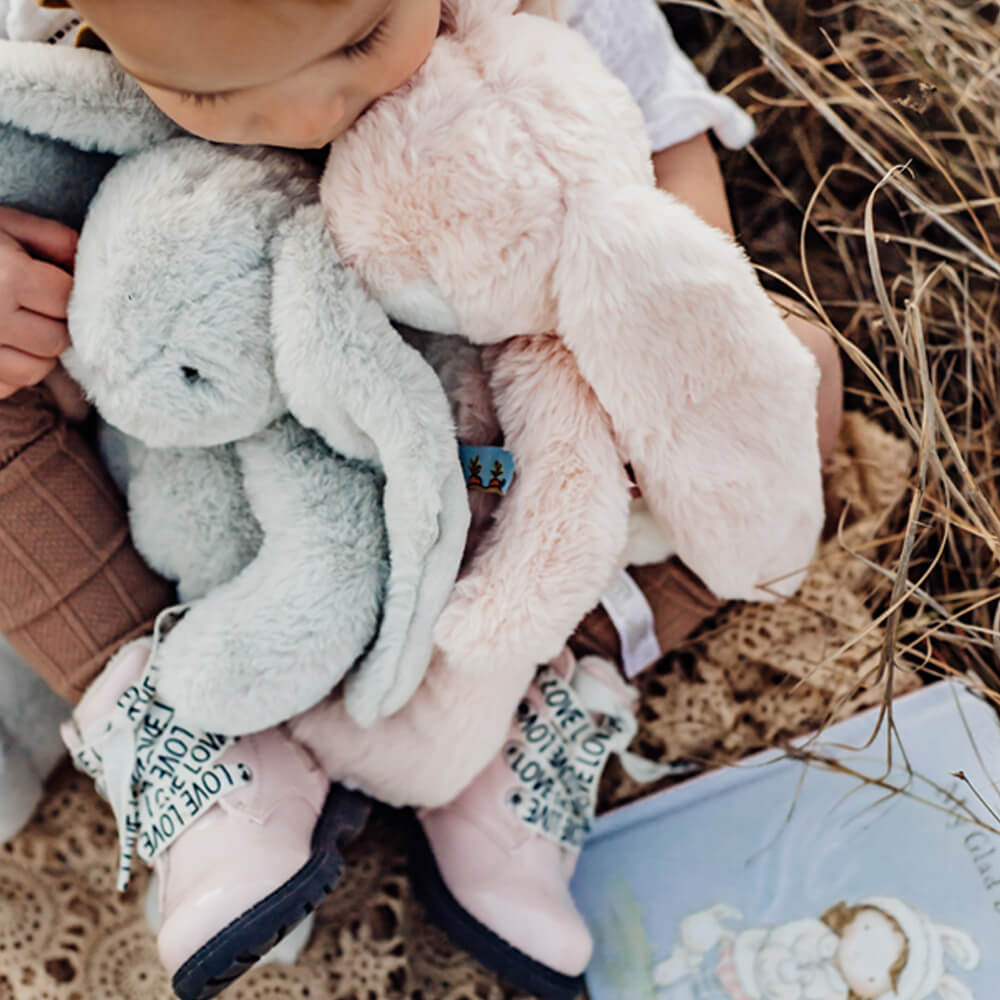 Meet Big Nibble Bunny! Huggable, luggable and simply adorable. Nibble’s long lop ears are buttery soft and perfect for soothing away worries. Dreamy Sugar Cookie fur, warm white tummy, tail, and muzzle.